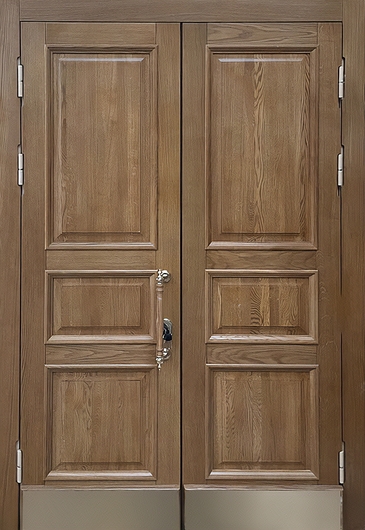Стальная двустворчатая термодверь с нержавеющими отбойниками и отделкой из массива — подойдёт тем, кто ценит качество и натуральные материалы. Панели из массива дуба отличаются экологичностью и долговечностью. Фасадное решение подходит владельцам домов с каменной или деревянной облицовкой.