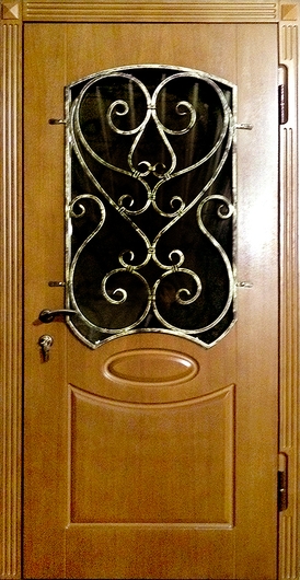 Металлическая дверь МДФ с ковкой «завитки» и стеклом для дома КД-283